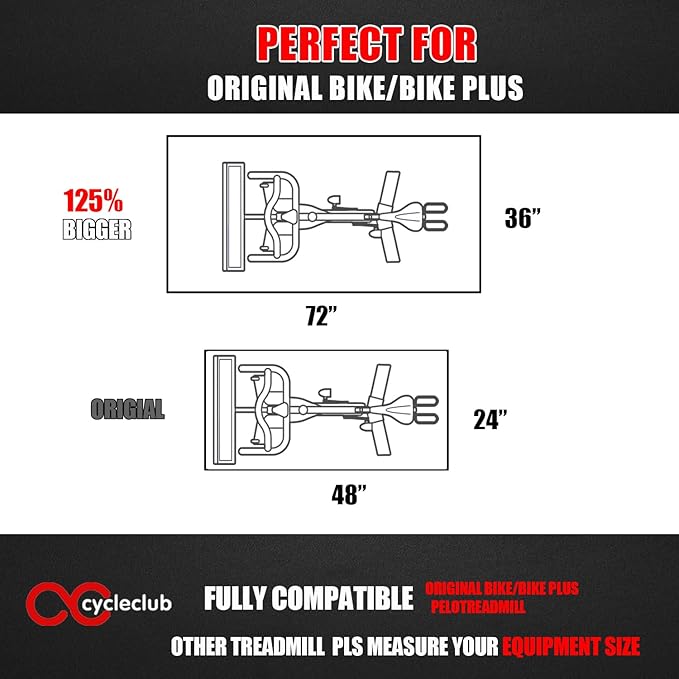 • |FULLY COMPATIBLE WITH PELOTREADMILL&BIKE| - The Cycleclub bike mat is made of soft PVC and designed specifically for spin bikes and treadmill(pls measure equipment size). Size of 36" x 72", it is 125% larger than the 24" x 48" mat. Perfect for most spin bike, treadmill & elliptical. But we still suggest measuring the dimensions of your equipment before making a purchase.And it is also a great choice for bike trainers, recumbent,ellipticals, rowers, steppers, upright and stationary bikes.