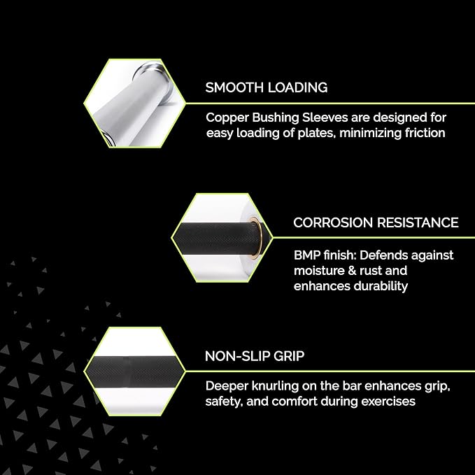 - 【 COPPER BUSHING SLEEVES 】: Our strength training bar has copper bushing sleeves that ensure a smooth and reliable spin, minimizing friction, offering long-lasting functionality, ideal for intense training sessions and reducing the strain on wrists and joints, promoting a more comfortable and efficient workout experience.