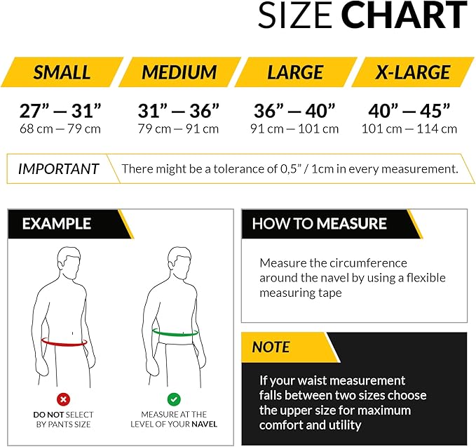 - PRECISE SIZING FOR OPTIMAL FIT: Use a flexible measuring tape around your navel for accurate sizing of this weightlifting belt. Don't rely on your pants size. A size chart is provided to ensure you get the perfect fit for maximum support and performance during your workouts.