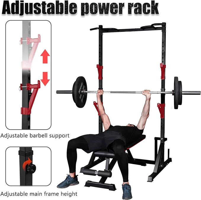 • ADJSTABLE BARBELL SUPPORT ARMS & HEIGHT:Single-side 17-hole barbell support arm with random height plus the main frame 6-speed height adjustment weight rack, whether doing squats or bench press can be well adapted to different heights and different parts of the exercise needs. Standard 1in adjustment hole to accommodate most market accessories