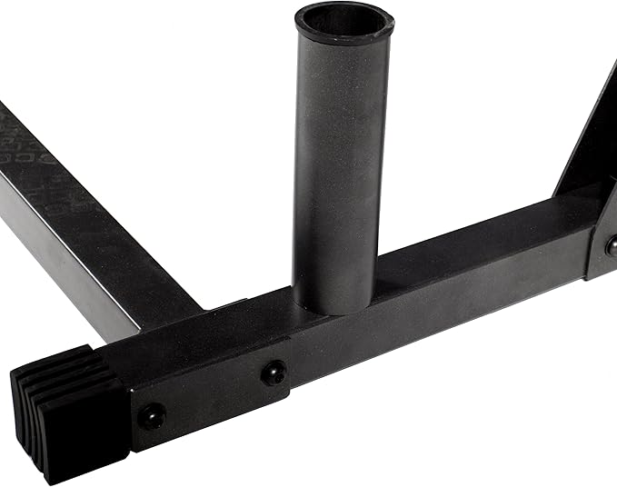 - MULTIPLE FEATURES - (1) Built-in bar and (1) weight storage. Double gusseted uprights provide exceptional stability and security. J-cup catches to safely hold barbell