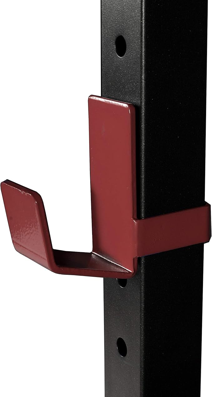 - MULTIPLE FEATURES - (1) Built-in bar and (1) weight storage. Double gusseted uprights provide exceptional stability and security. J-cup catches to safely hold barbell