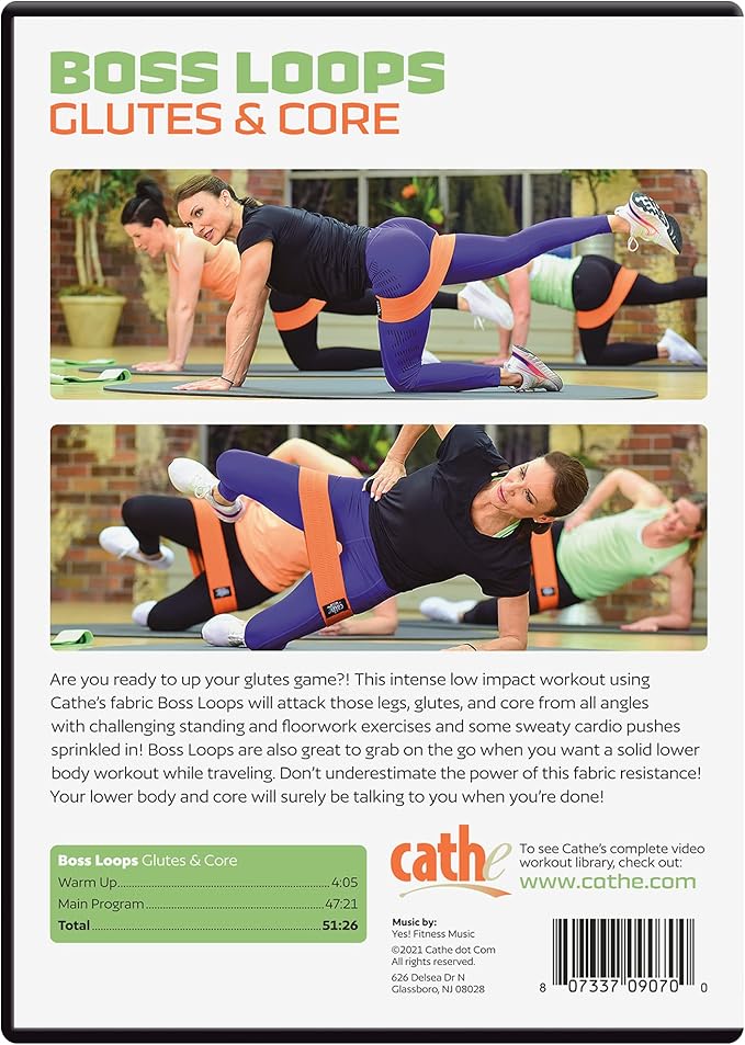 - INCLUDES CATHE FRIEDRICH'S BOSS LOOPS LOW IMPACT GLUTES & CORE WORKOUT DVD - This 51-minute Cathe Friedrich low impact fabric exercise bands workout DVD uses workout bands for legs and butt. This leg band workout also comes with 8 additional glutes & core workout premixes with various time options to fit your busy schedule and so you will never get bored.