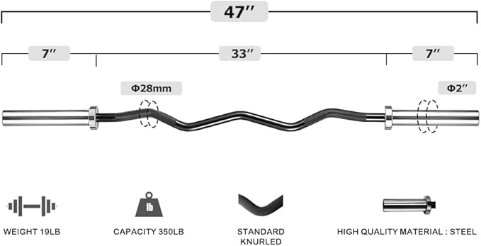 - 【CAPACITY】Our olympic weightlifting bar is 4 foot (47 inches) long, a solid 19 lbs, 28 mm diameter. Rated 350 lbs for weight capacity. You can depend on it for all your workouts.