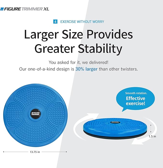 - โญ๏ธ ๐ฃ๐ฒ๐ฟ๐ณ๐ฒ๐ฐ๐ ๐ฆ๐ถ๐๐ฒ & ๐๐ฎ๐ฝ๐ฎ๐ฐ๐ถ๐๐: Our Figure Trimmer XL Ab Twister Board for Exercise features a robust 14-inch diameter, reinforced parts, and a weight capacity of 250 pounds, offering the ideal size for most adults needing extra room, support or have larger feet, unlike smaller, less stable alternatives.