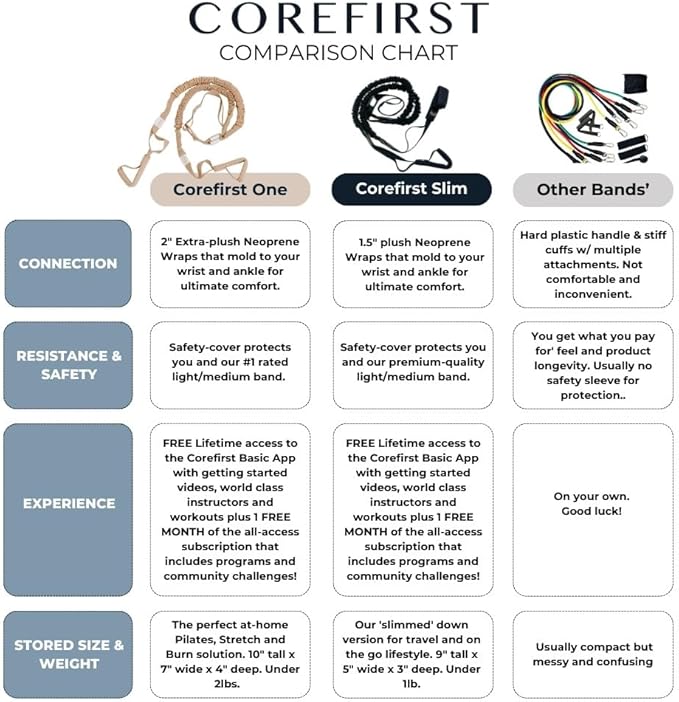 • ✔️COREFIRST SLIM: Meet the Corefirst Slim, the perfect blend of lightweight design and powerful resistance. Designed for the traveler in you, this band ensures that no matter where you are, your fitness routine remains uninterrupted. Experience the same resistance as the Level One, but in a more compact and travel-friendly form. Whether you're on a business trip, vacation, or just out and about, the Corefirst Slim is your go-to for a quick and effective workout