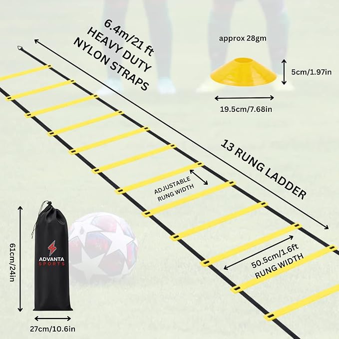 • ✅ PREMIUM AGILITY LADDER SET – The 21-foot agility ladder, 13 cones, 1 carry bag, & 4 stakes are all part of the ADVANTA SPORTS Agility Ladder Training Set. Everything is included to increase your explosiveness, agility, speed, &fitness. Designed for: football equipment, boxing training equipment, agility ladder and hurdles, football ladder, speed and agility training equipment, soccer practice equipment, basketball equipment training, speed ladder agility ladder, soccer coach, soccer trainer.