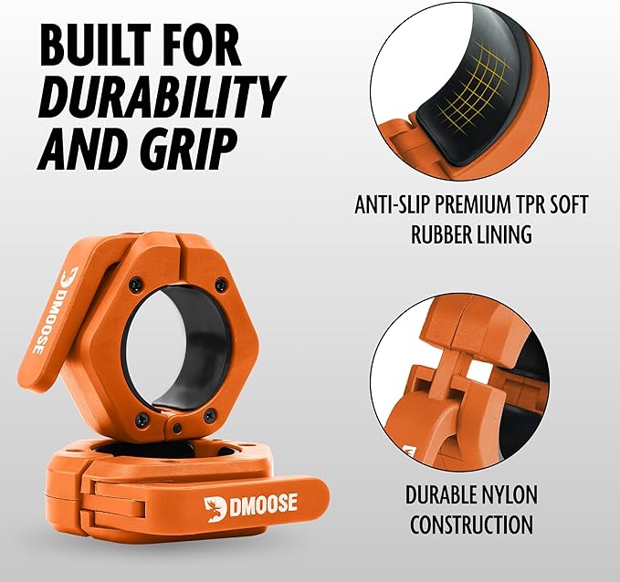 - 𝐃𝐔𝐑𝐀𝐁𝐋𝐄 𝐂𝐎𝐍𝐒𝐓𝐑𝐔𝐂𝐓𝐈𝐎𝐍 𝐖𝐈𝐓𝐇 𝐀𝐍𝐓𝐈-𝐒𝐋𝐈𝐏 𝐆𝐑𝐈𝐏: Built for durability and reliability, DMoose Barbell Collar is constructed with high-quality nylon polyamide and premium TPR soft rubber lining. The anti-slip grip of the Barbell Clamp ensures your weights stay in place, providing a safe and effective lifting experience. Trust in the robust build to withstand the toughest workouts and last for years, delivering consistent performance.