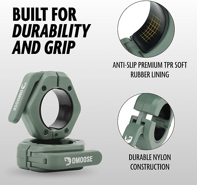 - 𝐃𝐔𝐑𝐀𝐁𝐋𝐄 𝐂𝐎𝐍𝐒𝐓𝐑𝐔𝐂𝐓𝐈𝐎𝐍 𝐖𝐈𝐓𝐇 𝐀𝐍𝐓𝐈-𝐒𝐋𝐈𝐏 𝐆𝐑𝐈𝐏: Built for durability and reliability, DMoose Barbell Collar is constructed with high-quality nylon polyamide and premium TPR soft rubber lining. The anti-slip grip of the Barbell Clamp ensures your weights stay in place, providing a safe and effective lifting experience. Trust in the robust build to withstand the toughest workouts and last for years, delivering consistent performance.