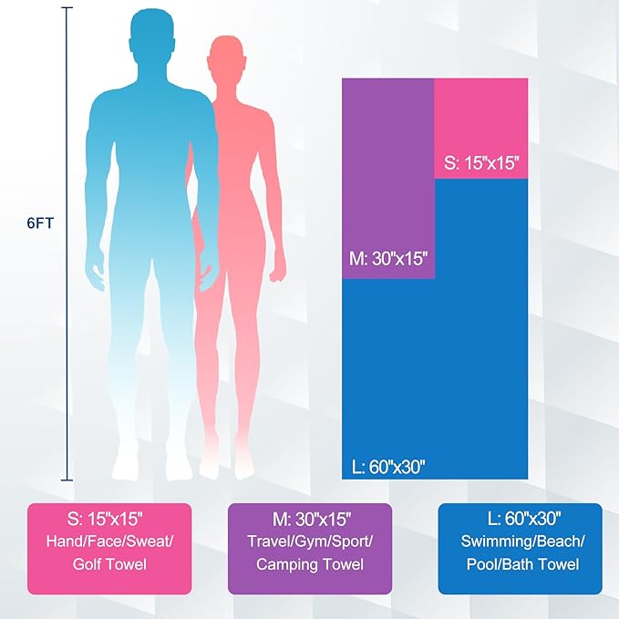 - 3 TOWELS AT 1 PACK: The package includes 3 towels of varying sizes. The small towel (S: 15''x15'') is suitable as a hand towel, perfect for gym and yoga classes due to its lightweight, soft, and quick sweat absorption. The medium towel (M: 30''x15'') is perfect for camping and designed for travel. The largest towel (L: 60''x30'') in the package is ideal for showering, as well as for use at the beach and pool. It is both large and portable