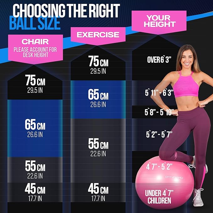 • FOUR SIZE OPTIONS FOR YOUR COMFORT AND SAFETY: 45cm, 55cm, 65cm, 75cm Not sure which is the right size for you? Our size guide helps you determine which size Exercise Ball best matches your intended use based on your body height if used for exercise, and the desk height if used as a chair.