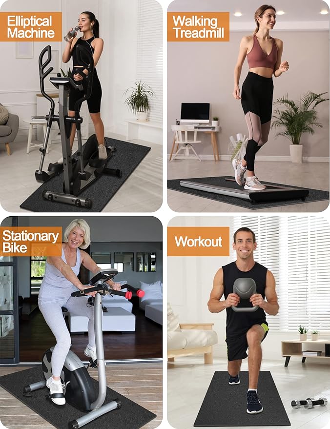- Ideal for Home Workout Equipment, 1 Year Quality Assurance: Size 30" x 60", thickened 0.24" workout mat for home gym equipment is perfect for a stationary bike, indoor cycling bike, spin bike, small size treadmill, or other home workout equipment. Perfect size helps you maximize in allocating your available space and saving space. Plus, we promise that our exercise equipment mat has a one-year quality assurance against any manufacturing defects in materials and workmanship.