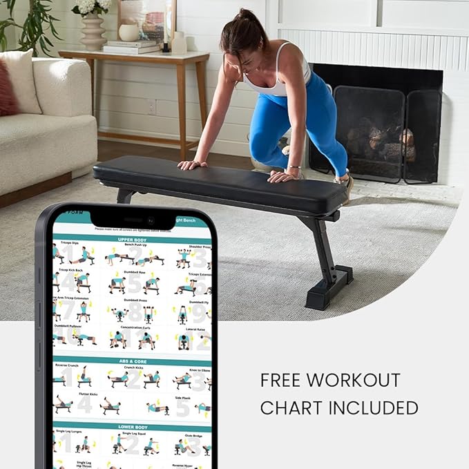 - Exercise Bench Convenient for Small Spaces - foldable flat bench easily and stores quickly under beds or in closets. The flat weight bench that's perfect for smaller apartments, offices or home gyms.