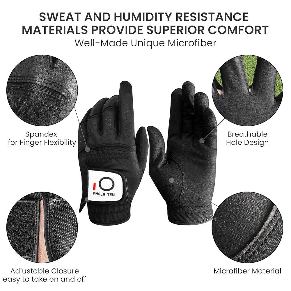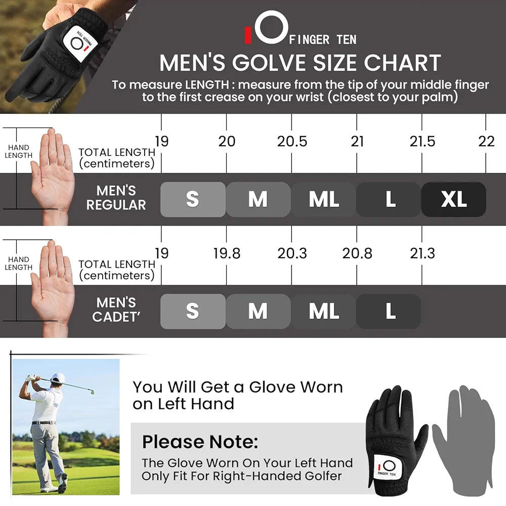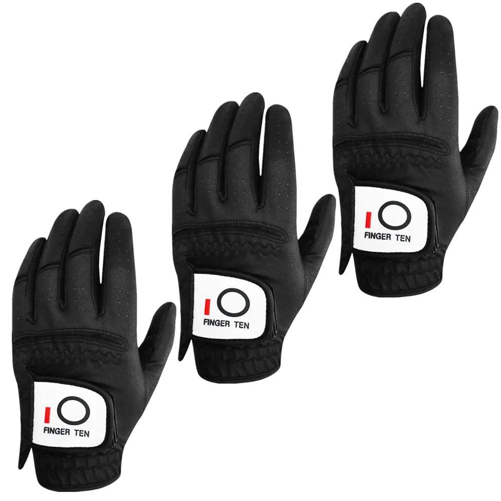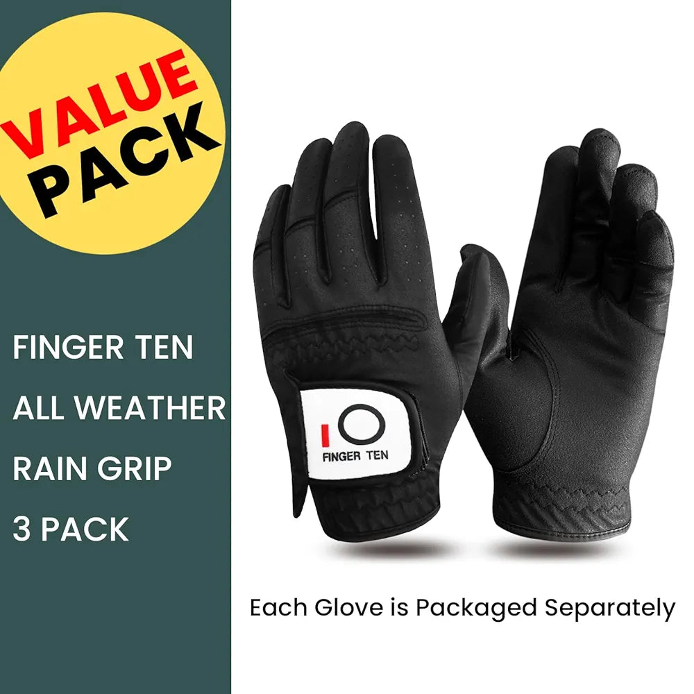 FINGER TEN Golf Gloves Men Left Hand Rain Grip Glove for Right Handed Golfer Value 3 Pack, All Weather Durable Grip Size Small Medium Large XL White Black Blue