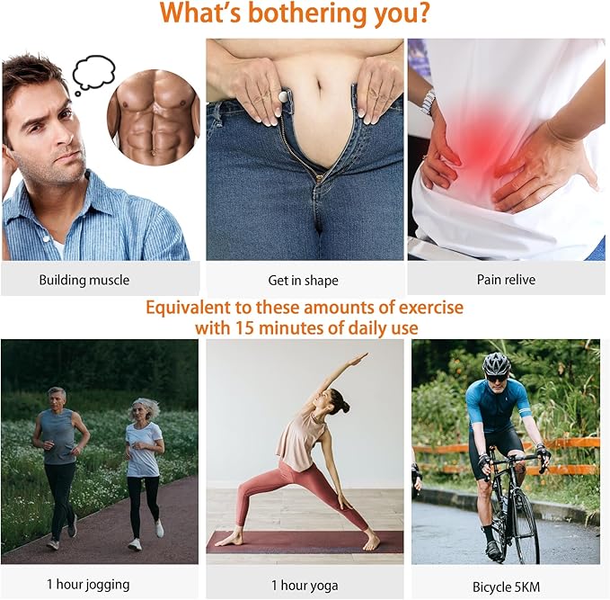 - Adjust the Fitness belt size according to your waist,the Fitness belt is 8 different modes and 15 intense levels