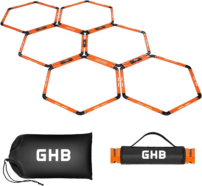 • 6 Set GHB Hexagonal Agility Rings: This package includes 6 set agility hexagon rings, each separate ring has a 21” diameter. 5 connectors for each rings to be connected. Premium agility training equipment for footwork basketball training