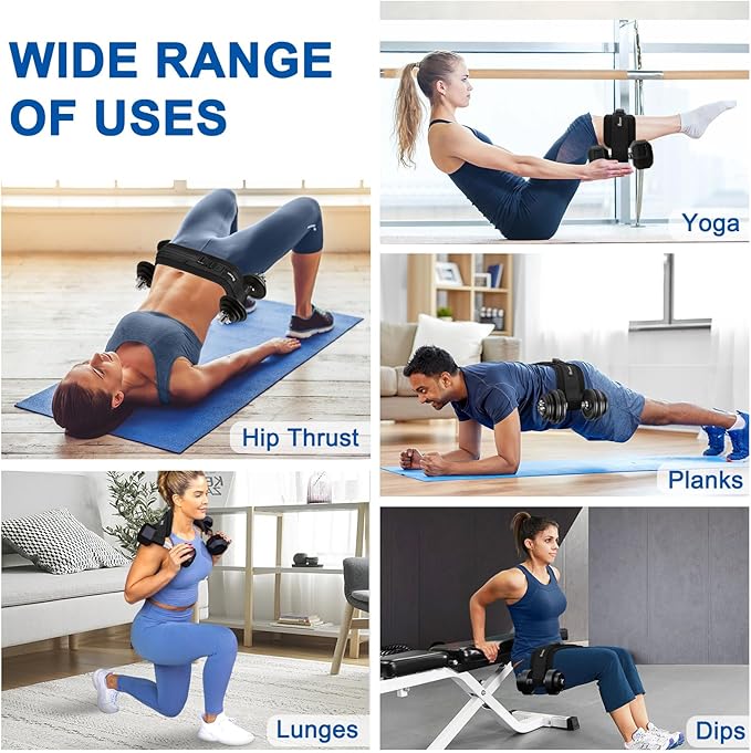 - 【Multi-Functional Fitness Companion】The multi-functional dumbbell belt for hip thrust can be used with dumbbells, kettlebells, plates or any type of weight to accommodate a variety of body shapes and sizes, whether male or female. Add weight to the hip thrust exercise band for dumbbell hip thrusts, glute bridges, squats, lunges, planks, parallel bar dips, reverse hyper extensions, B-stance hip thrust, single-leg hip thrusts, side lunges and push-ups.