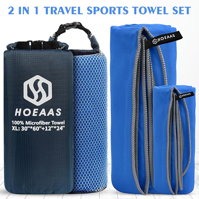 - SUPER ABSORBENT & QUICK DRYING: HOEAAS microfiber camping towel is made of soft and skin-friendly microfiber fabrics, which super absorbent and fast drying. Soaks up 5X its weight in water and dries nearly 10X faster than cotton towel, repeat use it a short time, no bad odors. So you never have to worry about your microfiber beach towels soiling or stinking up the rest of your gear. After dry your sweat or body water, Spread out or hang up the quick dry towel will be dry in minutes!