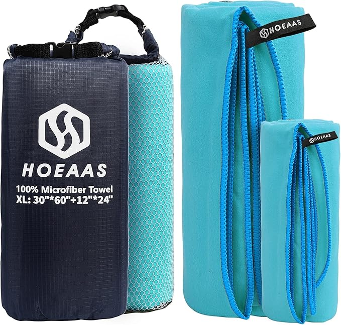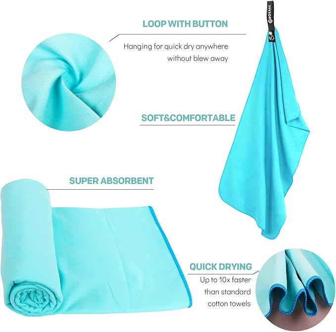 - LIGHTWEIGHT & EASY TO CARRY: Each quick dry towel set with a breathable carry bag and snap hook on the quick-release buckle provides a handy attachment point. The microfiber cloth material makes camping towel very thin. Large size but still super compact, portable and convenient. It can be rolled up small when you don't need to use it. The compact travel towel will nicely fit in your gym bag or backpack. Ideal for outdoor, camping, gym, yoga, hiking, backpacking, fitness and workout.