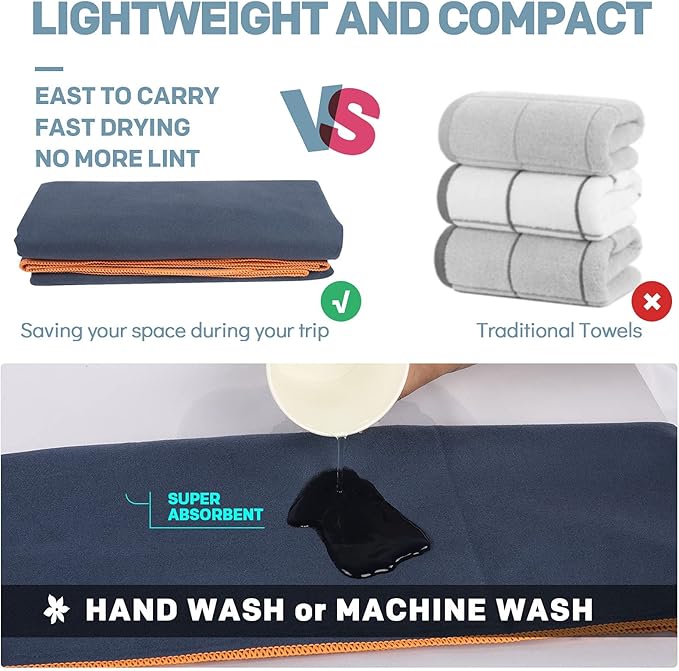 - MULTI-FUCNTIONAL QUICK DRY TOWEL & GIFT IDEA: Lightweight and compact microfiber towel for travel is super versatile for any situation. Such as backpacking, travel, camping, hiking, swimming, yoga, golf, gym, fitness, exercise. Perfect for covers your sun lounger, deck chair or camping undera beach umbrella&sun shelter. The travel towel also looks really fashionable and sporty, which makes it a great gift idea for your family and friends. Of course, if you have any problem, please contact us.