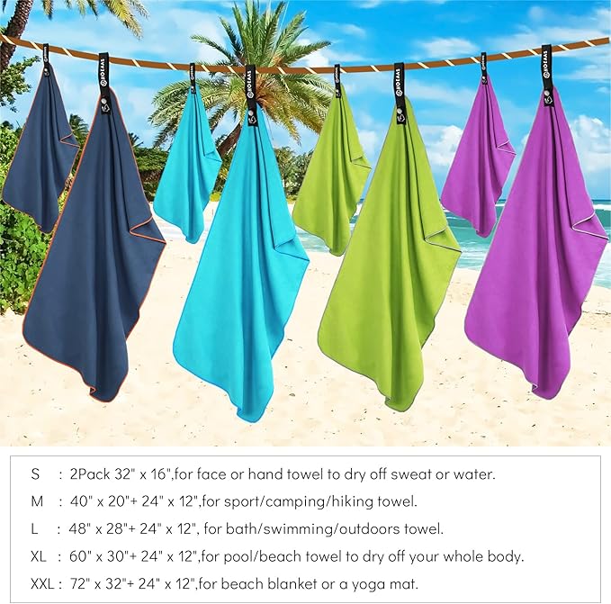 - GREAT OPTIONS & EASY HANG LOOP: Each HOEAAS microfiber towels with a hanging snap loop so it is convenient hanging for quick dry anywhere without blew away. S (2pcs 32 x 16 inch) used as face towel or workout towel. M (40 x 20inch+24 x 12inch) is perfect for sport towel to around your neck. L (48 x 28inch+24 x 12inch), used as bath towel or gym towels. XL(60 x 30inch+24 x 12inch) and XXL towel (72 x 32inch+24 x 12inch) is an ideal choice for yoga mat or beach blanket, perfect for pool and beach.