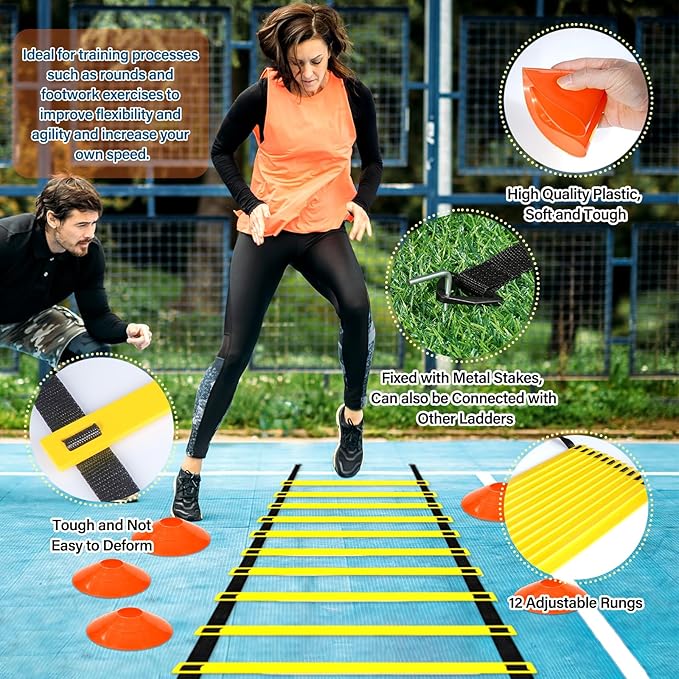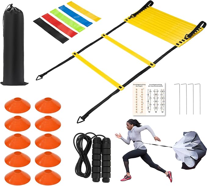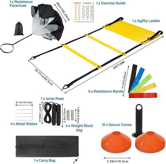 - The Most Complete Agility Ladder Training Set - Our sports agility ladder set includes 10 disc cones with brackets, 5 resistance bands, 4 metal stakes, 1 adjustable agility ladder, 1 running parachute, 1 skipping rope and 1 storage bag; comes with a wide range of speed training equipment that can be used to meet different training needs and improve your core strength.
