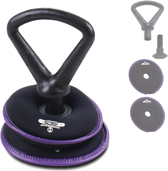 • SOFT QUIET adjustable weight plate bells, heavy-duty fiber glass handle, works with expandable SoftBell system of adjustable kettlebell, dumbbell and cardio barbell free weights that are compact, portable for travel, easy to store for at home fitness. Use SoftBell system strength training weights for children and physical education with adult supervision. No need for kettlebell wrist guards for men or women.