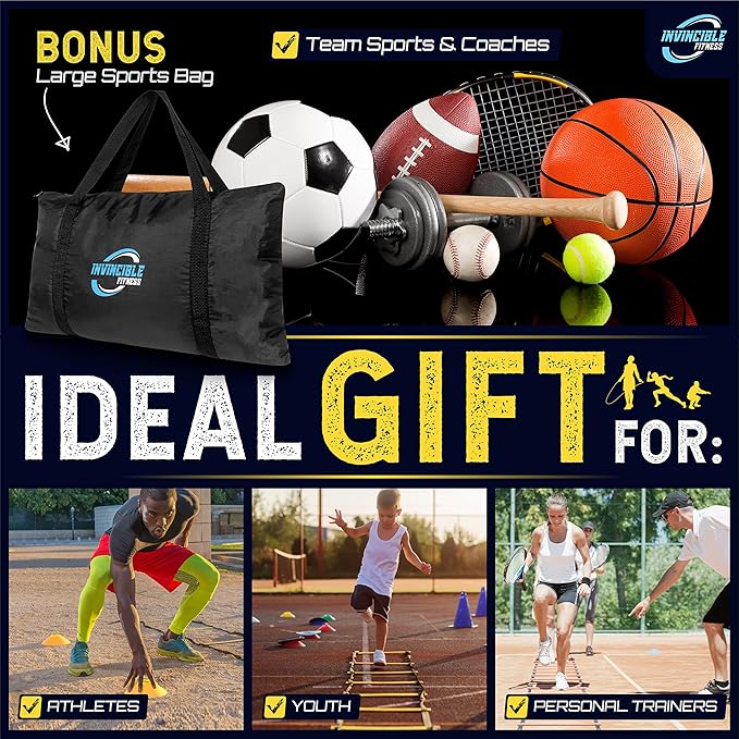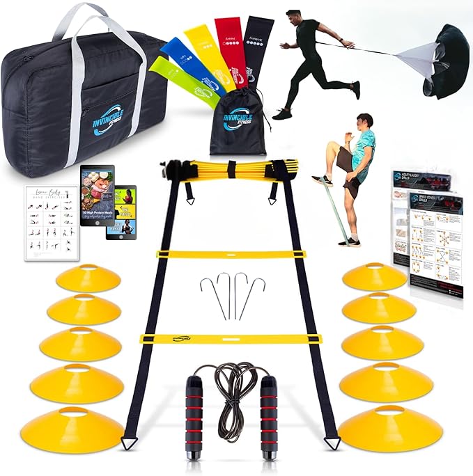 - ✓ Great Value Kit: Includes a 20ft agility ladder with 4 hooks, 10 cones, resistance parachute, jump rope, and 5 loop resistance bands—a complete set for your fitness workout.