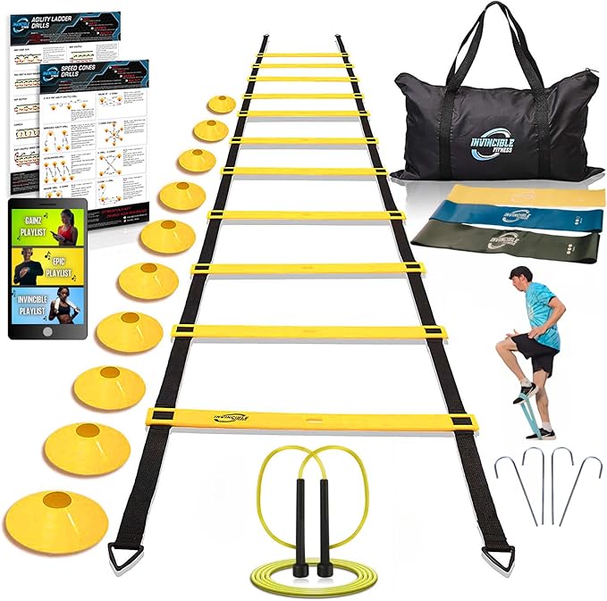 Invincible Fitness Agility Ladder Set - Enhance Speed 10 Cones, 4 Hooks, 3 Resistance (15ft)
