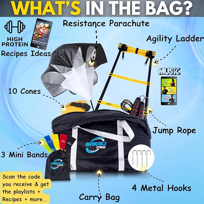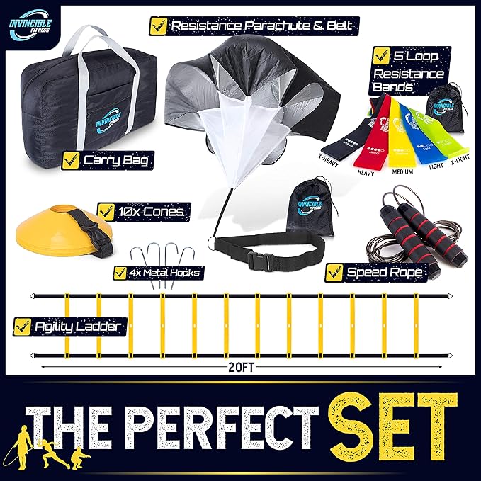 - ✓ Great Value Kit: Includes a 20ft agility ladder with 4 hooks, 10 cones, resistance parachute, jump rope, and 5 loop resistance bands—a complete set for your fitness workout.