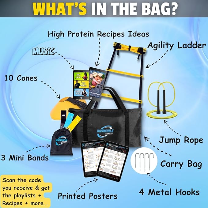 Invincible Fitness Agility Ladder Set - Enhance Speed 10 Cones, 4 Hooks, 3 Resistance (15ft)