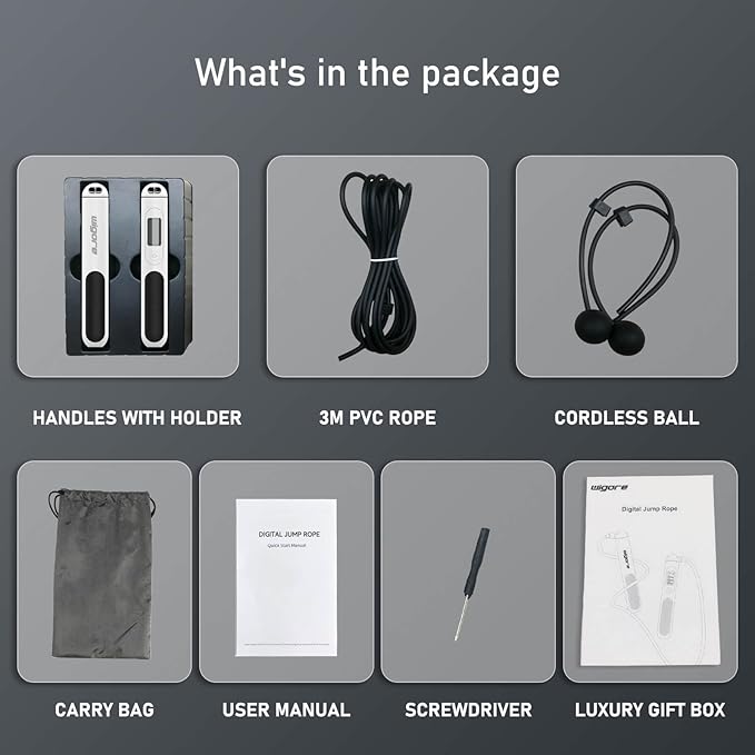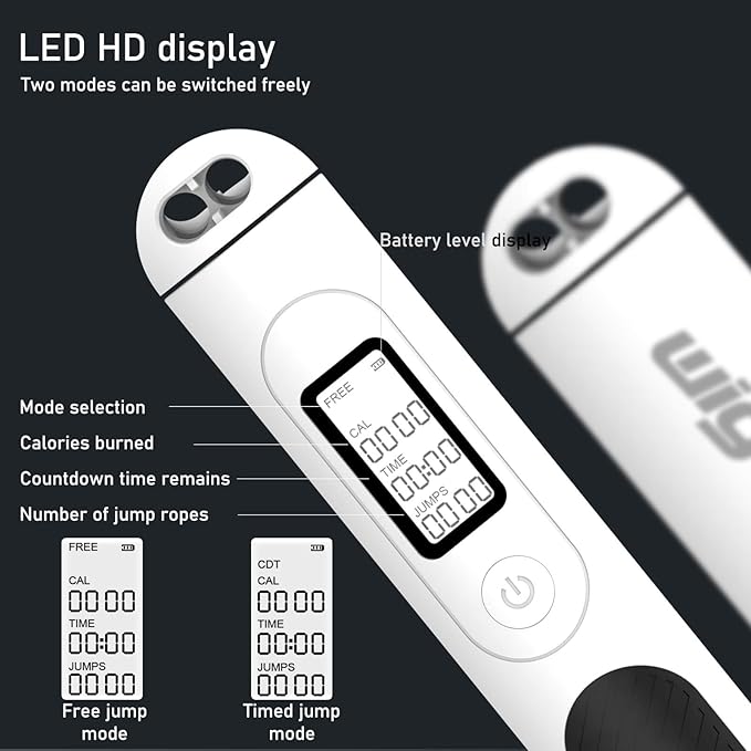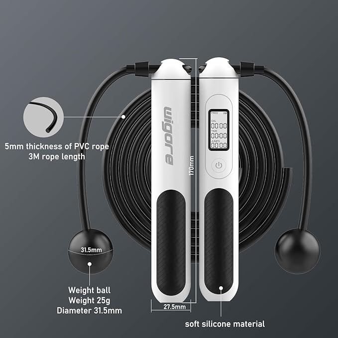 - 【LED HD Display & Ergonomic Handles】: Wigore jump rope are unique design for fitness are equipped with Ergonomic Handles that is made from friendly environmental ABS and non-polluting silicone material. ergonomic silica gel non-slip grip. Non-slip, non-toxic, and tasteless for safe use. The comfortable hand grip reduces fatigue and makes exerting force easie,Also,the main handle is embedded with a backlit LCD display that provides users a clear view of your workout