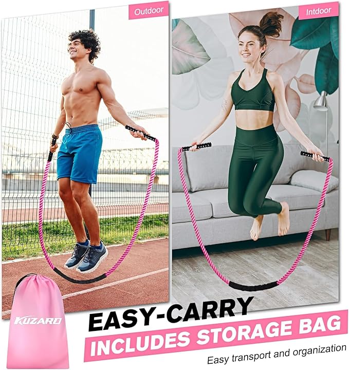 - 【High Quality Heavy Duty Skipping Rope】Enjoy a comfortable, secure grip with our anti-slip handles made from quality polyolefin material, designed to protect your wrists and palms during exercise. Paired with a heavy-duty polymer fiber rope for optimal weight and longevity, the KUZARO Jump Rope is crafted to support your fitness goals with both comfort and resilience.