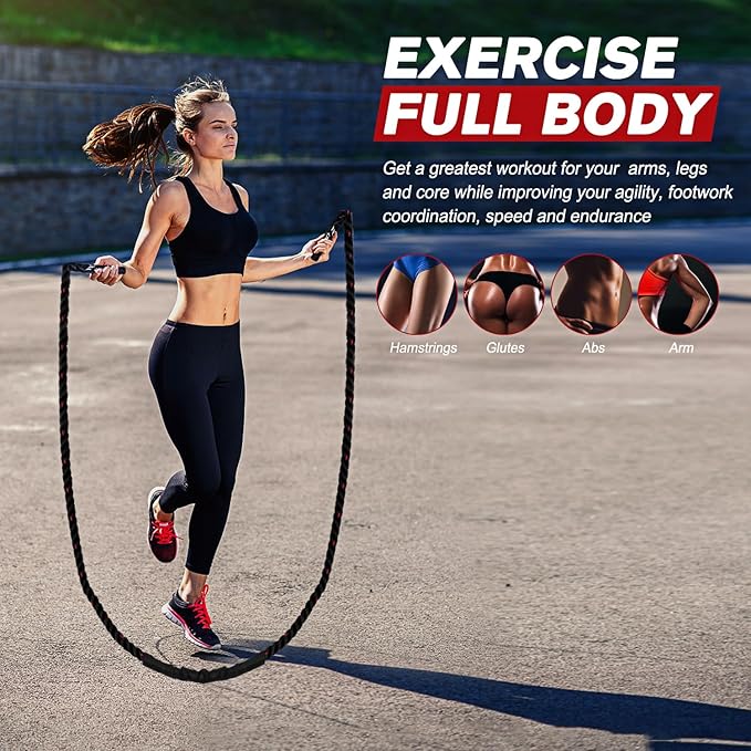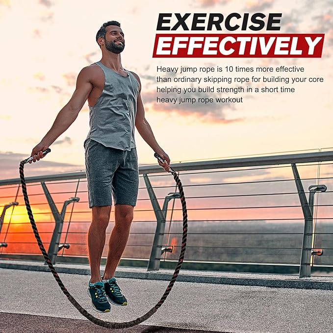 - 【Perfect Choice for Fitness】It's no secret that skipping rope is a great way to get fit, using a heavy jump rope helps to exercise the whole body, jumping with weighted jump rope for five minutes is equivalent to 30 minutes with ordinary skipping rope, Double weight multi-fold fat burning and can be effective for increasing strength and promoting weight loss, in order to better yourself, please use weighted jump rope to jumping now!