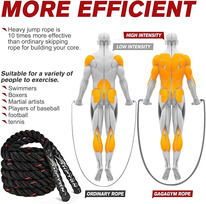 • 【Perfect Choice for Fitness】It's no secret that skipping rope is a great way to get fit, using a heavy jump rope helps to exercise the whole body, jumping with weighted jump rope for five minutes is equivalent to 30 minutes with ordinary skipping rope, Double weight multi-fold fat burning and can be effective for increasing strength and promoting weight loss, in order to better yourself, please use weighted jump rope to jumping now!