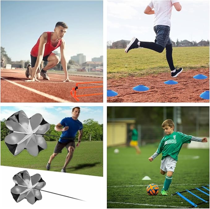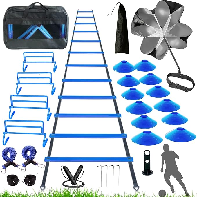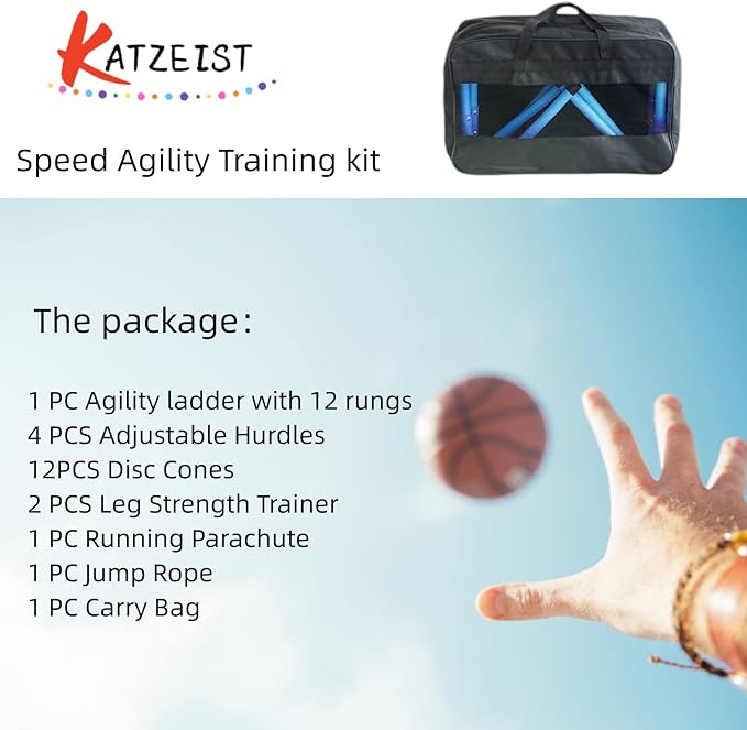 • Agility Training Kit Package: The hurdles training equipment package come with:Agility ladder with 12 rungs*1,Adjustable Hurdles*4, Disc Cones*12, Leg Strength Trainer*2,Running Parachute*1,Jump Rope*1,Pegs*4,Carry Bag*1