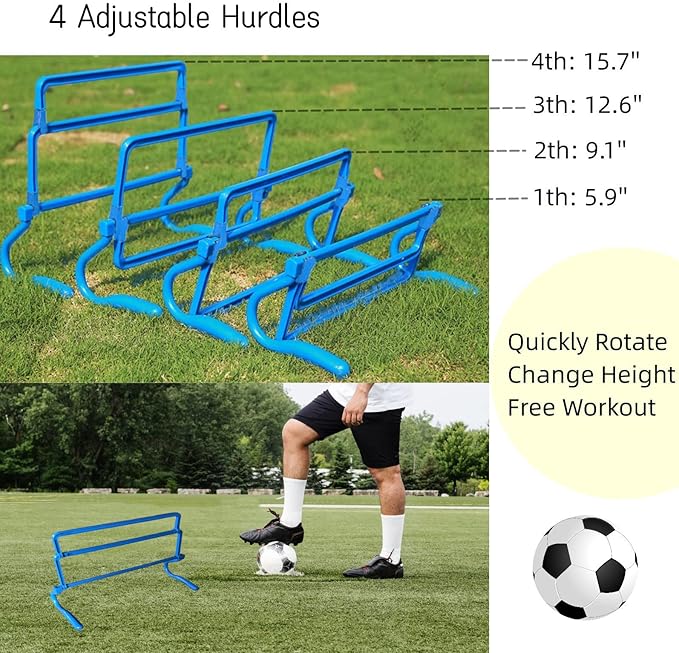- Agility Training Kit Package: The hurdles training equipment package come with:Agility ladder with 12 rungs*1,Adjustable Hurdles*4, Disc Cones*12, Leg Strength Trainer*2,Running Parachute*1,Jump Rope*1,Pegs*4,Carry Bag*1