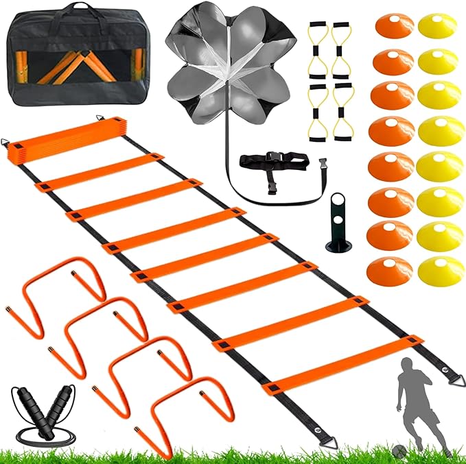 - Agility Training Kit Package: The agility training equipment package come with:Agility ladder with 12 rungs*1,Adjustable Hurdles*4, Disc Cones*16, Resistance Bands *4,Running Parachute*1,Jump Rope*1,Pegs*4,Carry Bag*1