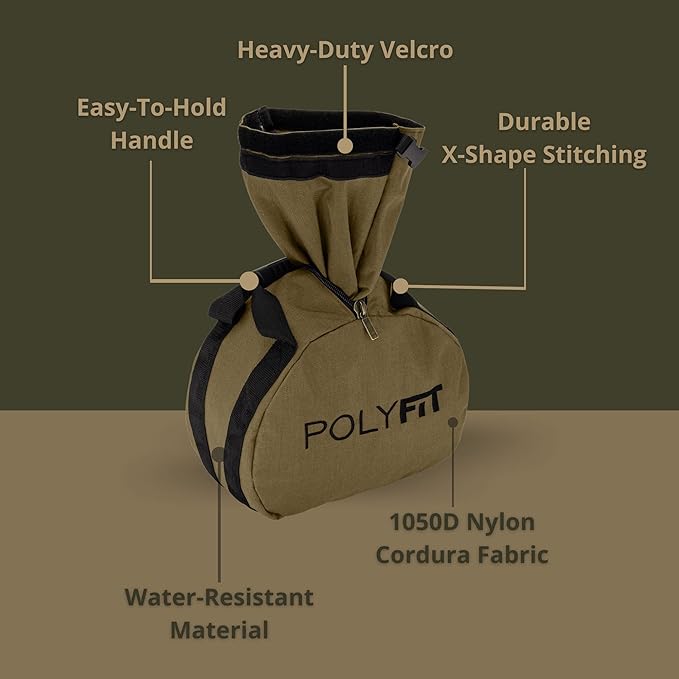 • GUARANTEED LEAK-PROOF & DURABLE | NON-SLIP HANDLE. The Polyfit Kettlebell Sandbag is secured with enforced stitching on both the velcro and the zipper, so you can do your strength training and conditioning exercises with confidence. The handle is designed with a comfortable grip, which allows for better execution.