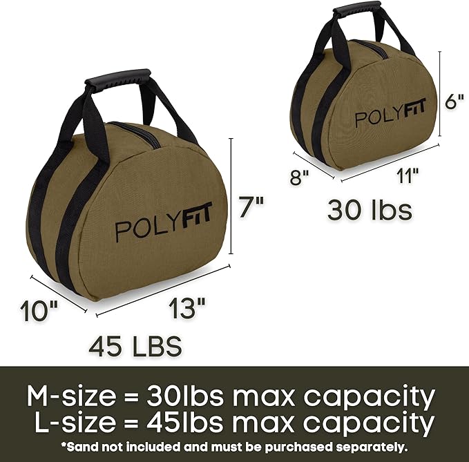 • AVAILABLE IN 2 SIZES | KETTLEBELL SANDBAG FOR WORKOUT. Polyfit’s Kettlebell Sandbag is the easier alternative to buying a full set of plates and weights. With 2 sizes to choose from: 30lbs max capacity and 45lbs max capacity, you get all of the benefits of kettlebell training equipment without the hefty price tag. Just add sand for a sandbag workout that will help you develop functional strength.