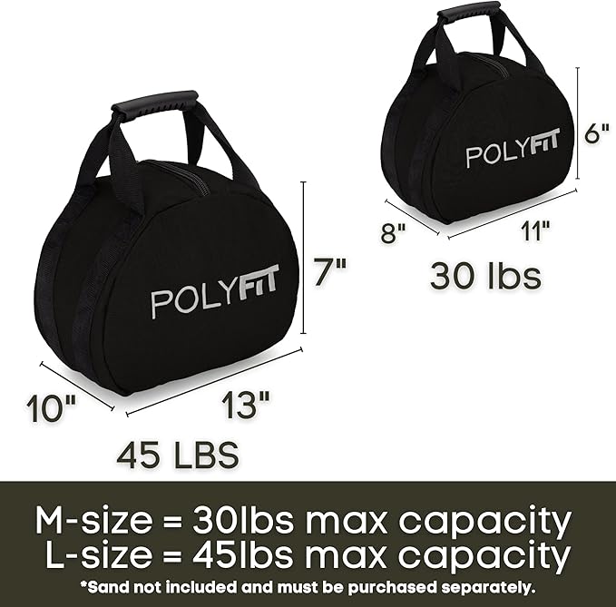 - AVAILABLE IN 2 SIZES | KETTLEBELL SANDBAG FOR WORKOUT. Polyfit’s Kettlebell Sandbag is the easier alternative to buying a full set of plates and weights. With 2 sizes to choose from: 30lbs max capacity and 45lbs max capacity, you get all of the benefits of kettlebell training equipment without the hefty price tag. Just add sand for a sandbag workout that will help you develop functional strength.