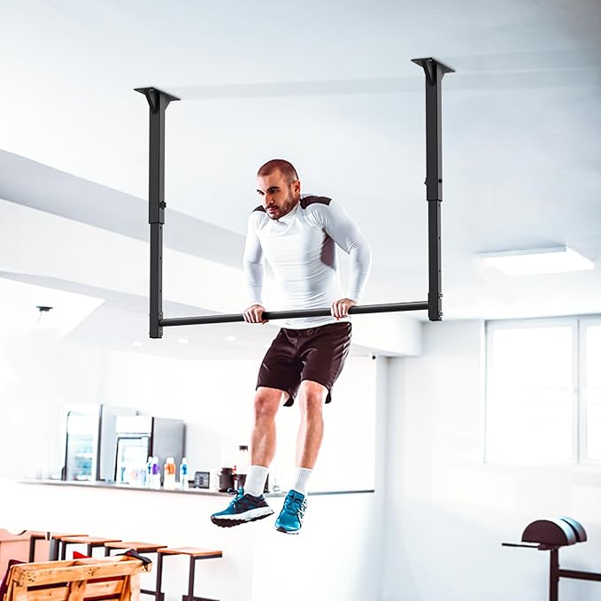 - Adjustable Height: This ceiling mounted pull up bar can be adjusted in 4 levels of height, from 25" to 41", to fit different exercise spaces and preferences.