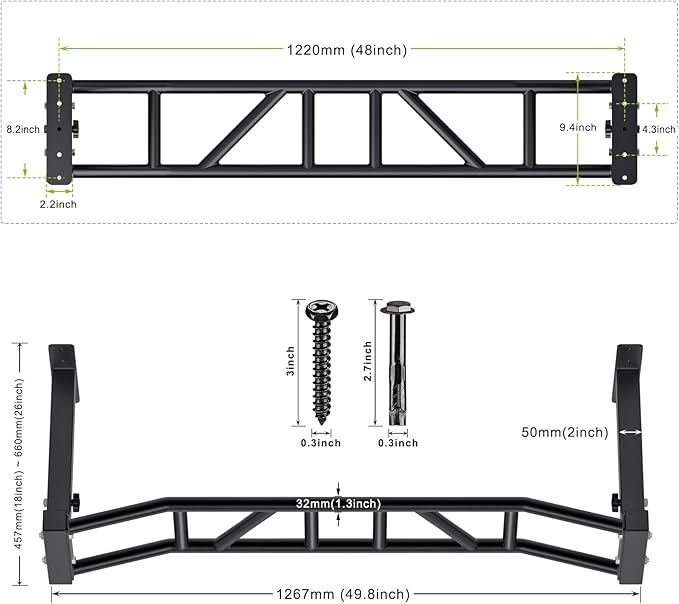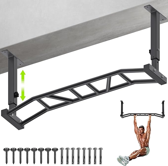 - 【Easy Installation】Our pull-up bar comes with all the mounting screws you need, including wood screws for mounting on wood and pull-pop screws for mounting on concrete walls. The mounting holes are spaced 48 inches apart to accommodate ceiling studs spaced 12 inches and 24 inches apart, and the mounting base is 2.2 inches wide, perfect for studs 2 inches and up.