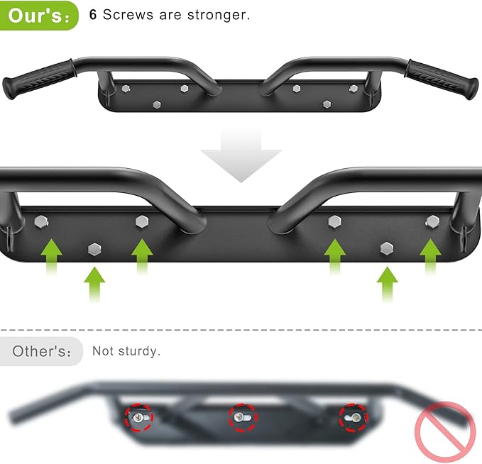 - 🏋️♂️【Stable and Safe Wall Mount】This pull-up bar features a unique 6-hole design on the triangular base plate, which distributes the pressure evenly. Unlike other pull up bars with only 3 or 4 holes, our pull up bar offers more stability and safety for your exercise. It can support up to 440 lbs of weight without wobbling or shaking.