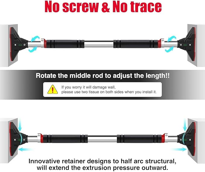 - 【No Screws & No Drilling】The pull up bar is designed with two widening anti-skid devices on both sides.It's very simple to install, just need to twist both sides to get it to the length by useing our Hex Wrench.