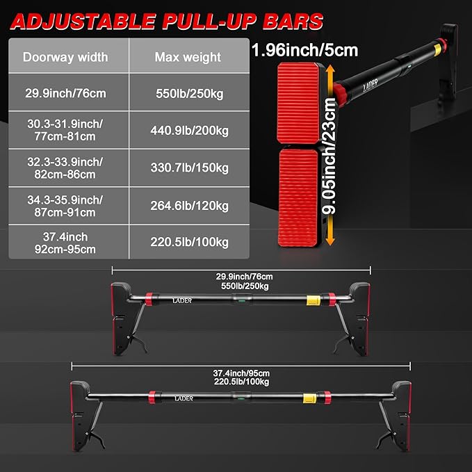 - 【Fully Adjustment Pull Up Bar】The pull-up bar can fit in most door frame between29.9"- 37.4" adjusted by the Hex Wrench.t can be installed in any cement walls, security doors, solid wood doors, corridors but not including fragile door frames,Suitable for standard doorway, perfect for home, garage or office use.