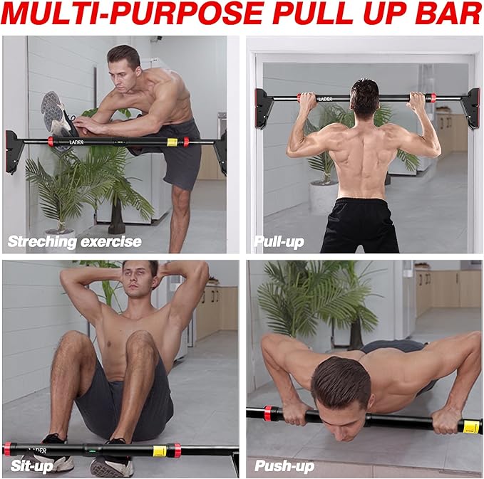 - 【Multiple Muscle Group Exercises】Our home gym bar allows you to perform a variety of upper body strengthening exercises.You also can move the upper body workout bar down to the lower part of the doorway for sit-ups, push-ups, dips, crunches and even stretching.