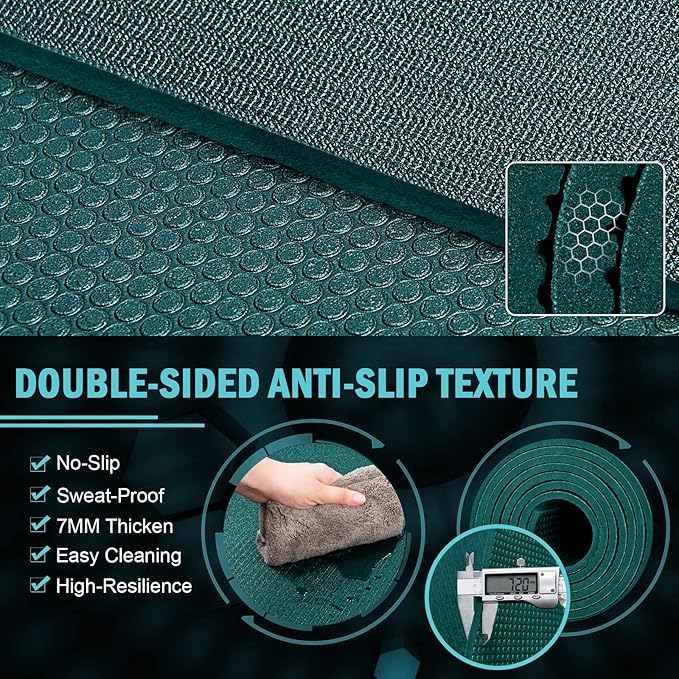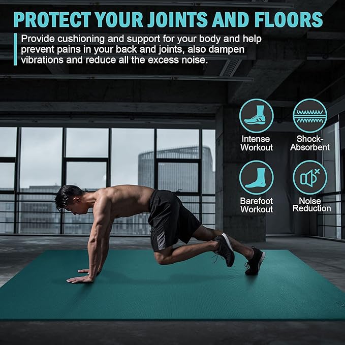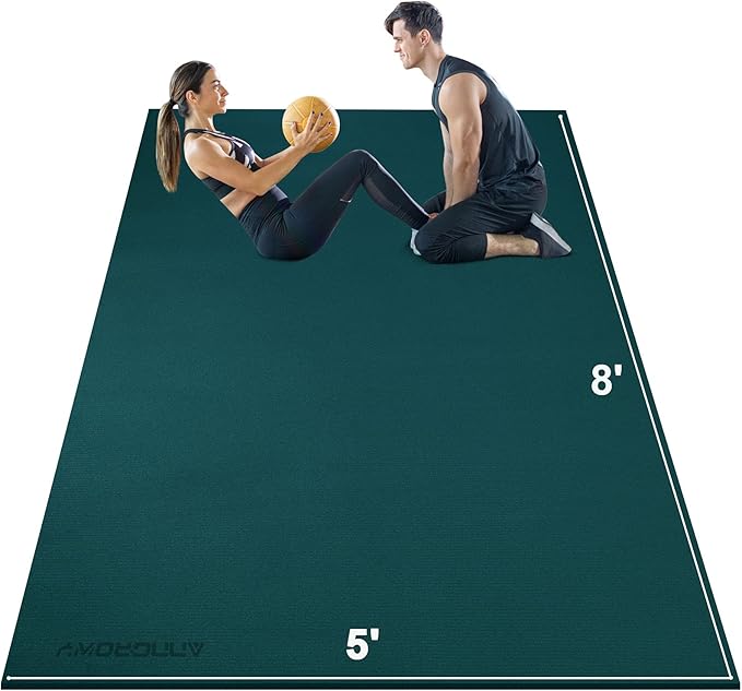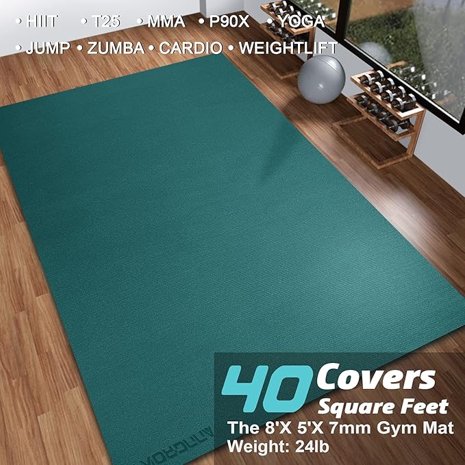 - ✅EXTRA-LARGE HOME GYM MAT COVERS 40 SQUARE FEET: The 8’x5’x7mm large fitness mat instantly transforms any space into a professional gym, giving you and your partners more than enough room to workout on without feeling cramped, and the floor mat is even shoe-friendly, whether you’re doing cardio, yoga, weightlift, dance workout including P90x, MMA, TAM, insanity, T25, Zumba, TRX, kettlebell, jumping rope or need large mats to install underneath a treadmill or weight bench, try this exercise mat.