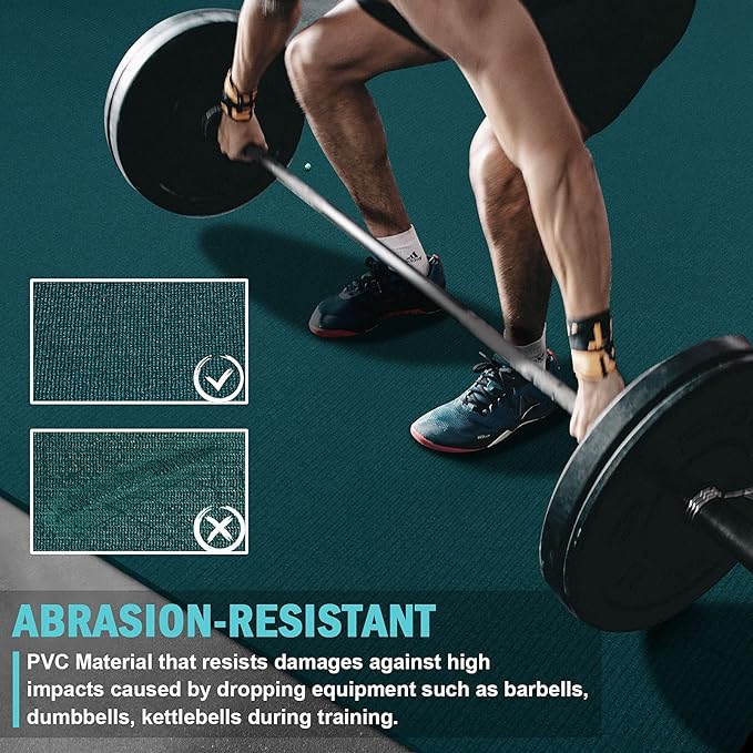 - ✅ UPGRADED ABRASION-RESISTANT NO-SLIP PADDING: Workout mats' top utilizes a smart PVC material, that’s designed to prevent tear and scratch, resisting damages against high impacts caused by dropping equipment such as barbells, dumbbells during training, making exercise mats for home workout easier to wipe up after use. Bottom circle-pattern prevent gym floor mat from sliding around and secure traction, the sports mats create perfect combination of heavy-duty toughness, comfort and stability.