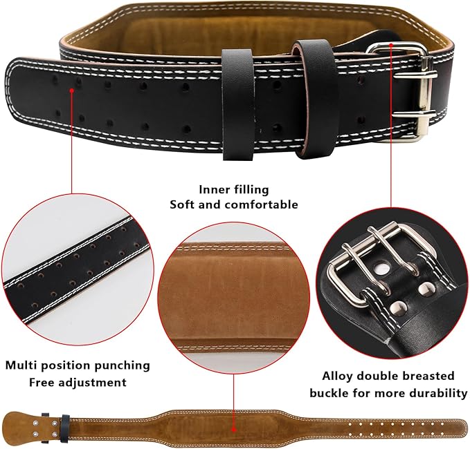- Perfect Design: Made from leather and the 8 mm thick weightlifting belt that is hard to break and tear. The design of stainless steel buckle Each belt is reinforced with 6 stainless steel rivets and uses fine stitching technology - double-layer sewing; each belt has 10 rows of holes that will be free to adjust the waist circumference and feel comfortable.